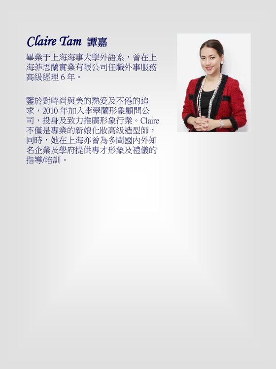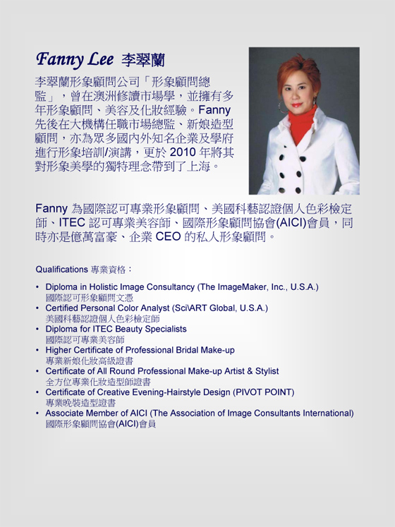 现今的世界日趋一体化,社会渴求拥有卓越能力 (Comptnc) 及良好外维形象 (Apparanc) 的复合型专才,因此我们创办李翠兰形象顾问公司来推广个人形象的重要性。良好的个人形象,不仅能提供一个人的信用指标,更可增强自信心、改善人际关系,并且在正面回馈的循环中,自我形象又再得以提升。我们会依据您的需要而为您度身打造出含个人风格的形象。