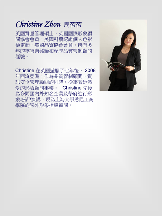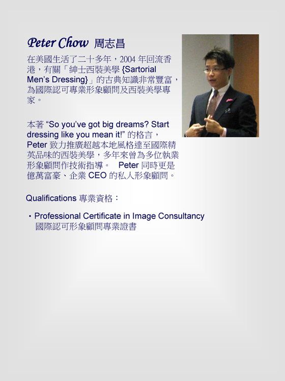 我们的服务与别不同,不仅因应本地市场的需要,同时亦紧贴国际大气侯。故此我们引进了美国顶尖级的《12色系个人色彩分析》及魅力男士必修的《绅士西装美学 》,务求服务精益求精。我们「用心」协助每位客人改善个人形象,提供专业意见,令客人「知其然」之馀,更重要是令客人也「知其所以然」,从而真正的受益一生。 |