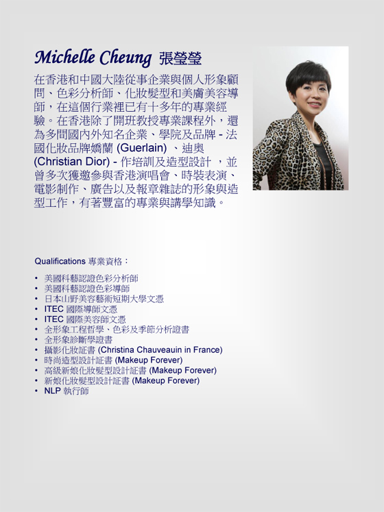 同时,我们亦提供形象教学如专业新娘化妆师证书课程、美容化妆班、专业形象塑造课程及求职面试工作坊等。另外更可为大小企业及教育机构举办形象培训、增值课程/讲座,帮助参加者建立企业需要的专业形象,增进客户关系,从而缔造更多商机。